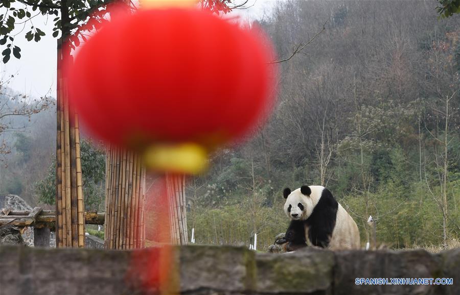 El panda gigante "Yingying" juega en la base de Dujiangyan del Centro de Conservación e Investigación para el Panda Gigante de China, en la provincia de Sichuan, en el suroeste de China, el 27 de enero de 2017. Los empleados siguen trabajando en el centro para cuidar de los pandas gigantes durante las vacaciones del Festival de Primavera. (Xinhua/Xue Yubin)