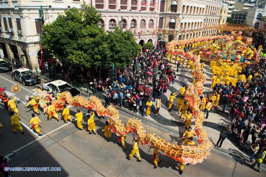 MACAO, enero 28, 2017 (Xinhua) -- Artistas realizan la danza del dragón para celebrar el A?o Nuevo Lunar chino en Macao, en el sur de China, el 28 de enero de 2017. (Xinhua/Cheong Kam Ka)