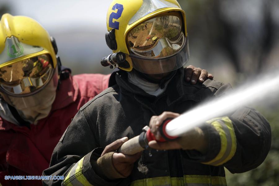 SAN CARLOS, enero 28, 2017 (Xinhua) -- Bomberos rocían agua con una manguera en el lugar donde se registra un incendio forestal en el sector de Changaral en San Carlos, en la región de Bío Bío, Chile, el 28 de enero de 2017. La presidenta de Chile, Michelle Bachelet, dijo hoy que el origen de los incendios forestales que han arrasado con medio millón de hectáreas en el país es aún desconocido, sin embargo se?aló que no se puede descartar una acción intencionada. (Xinhua/Juan González/AGENCIA UNO)