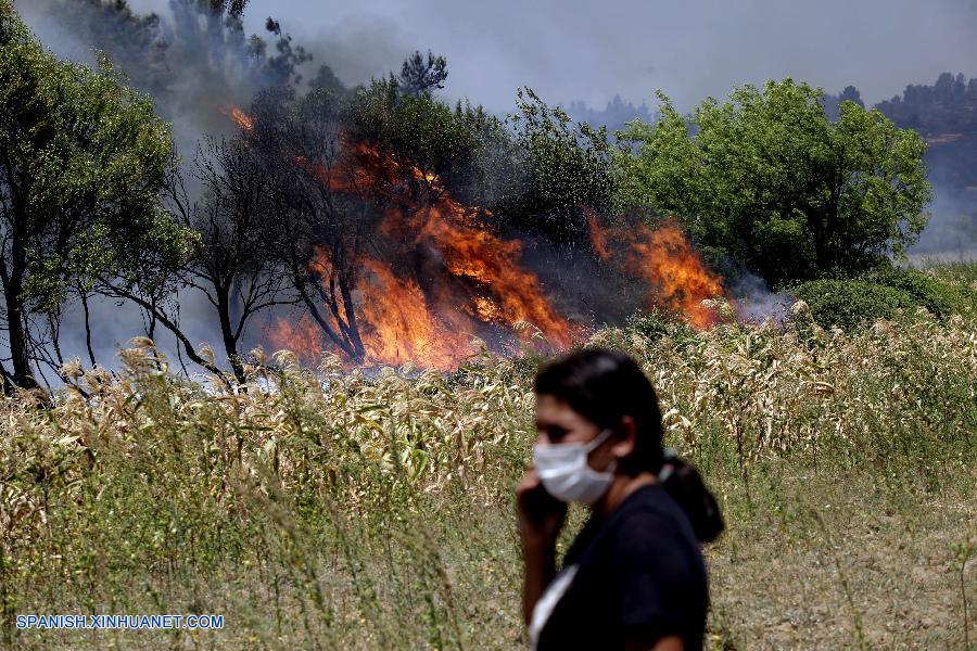 SAN CARLOS, enero 28, 2017 (Xinhua) -- Una mujer se protege con un cubreboca en el lugar donde se registra un incendio forestal en el sector de Changaral en San Carlos, en la región de Bío Bío, Chile, el 28 de enero de 2017. La presidenta de Chile, Michelle Bachelet, dijo hoy que el origen de los incendios forestales que han arrasado con medio millón de hectáreas en el país es aún desconocido, sin embargo se?aló que no se puede descartar una acción intencionada. (Xinhua/Juan González/AGENCIA UNO)
