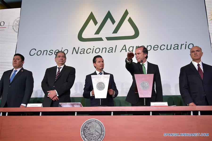 Imagen cedida por la Presidencia de México, del presidente mexicano Enrique Pe?a Nieto (c), participando durante la clausura de la XXXIII Asamblea General Ordinaria del Consejo Nacional Agropecuario (CNA), en la Ciudad de México, capital de México, el 2 de febrero de 2017. Durante el evento, Enrique Pe?a Nieto aseguró que su país renegociará el Tratado de Libre Comercio de América del Norte (TLCAN) con apego a las formas diplomáticas y exigiendo respeto para la nación. (Xinhua/Presidencia de México)