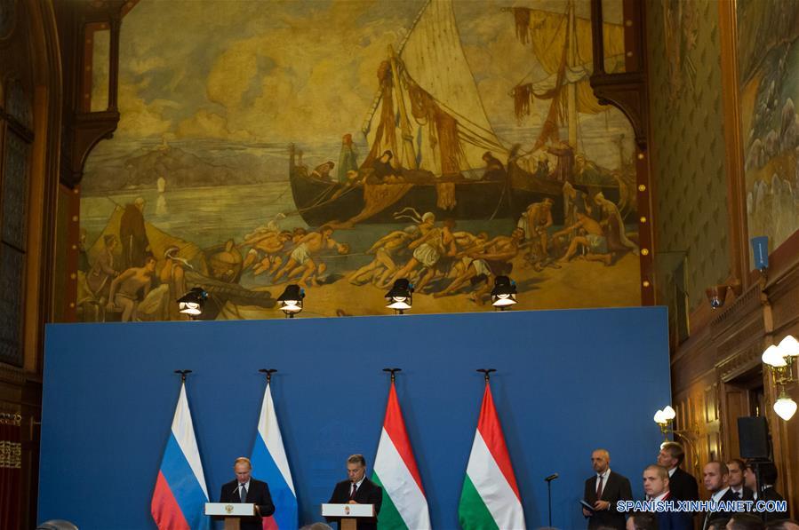 El presidente de Rusia, Vladimir Putin (i), y el primer ministro húngaro Viktor Orban (2-i), participan en una conferencia de prensa después de su reunión en Budapest, Hungría, el 2 de febrero de 2017. Vladimir Putin y Viktor Orban coincidieron el jueves en la necesidad de reforzar la cooperación en el combate al terrorismo internacional durante sus conversaciones en Budapest. (Xinhua/Attila Volgyi)
