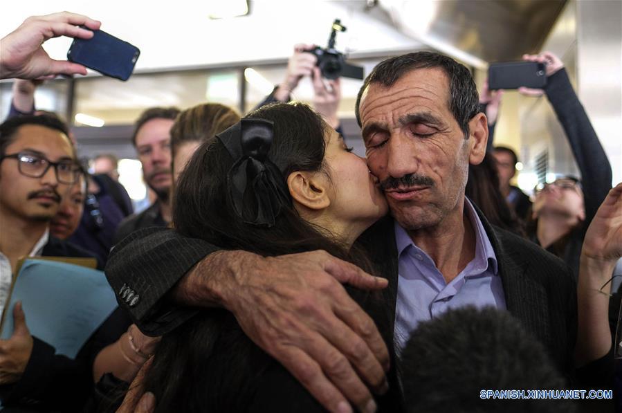 El ciudadano iraní con visa estadounidense Ali Vayeghan (d), quien fue expulsado tras llegar el 27 de enero a Estados Unidos de América, luego de que el presidente estadounidense, Donald Trump, firmó una orden ejecutiva para restringir la entrada a su país a refugiados y ciudadanos de siete países de mayoría musulmana, es recibido por su sobrina Marjan Vayghan (i-frente), en el Aeropuerto Internacional de Los Angeles, en California, Estados Unidos de América, el 2 de febrero de 2017. De acuerdo con información de la prensa local, Ali Vayeghan es la primera persona expulsada de Estados Unidos de América luego de la firma de la orden ejecutiva de Trump a la que se le permite regresar al país por una orden judicial. (Xinhua/Ringo Chiu/ZUMAPRESS)