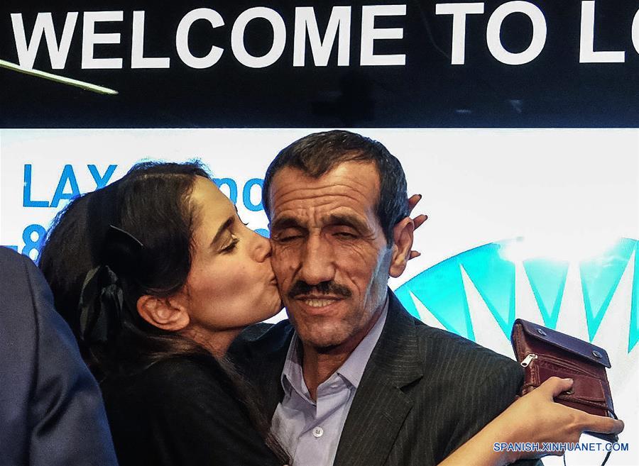 El ciudadano iraní con visa estadounidense Ali Vayeghan (d), quien fue expulsado tras llegar el 27 de enero a Estados Unidos de América, luego de que el presidente estadounidense, Donald Trump, firmó una orden ejecutiva para restringir la entrada a su país a refugiados y ciudadanos de siete países de mayoría musulmana, es recibido por su sobrina Marjan Vayghan (i), en el Aeropuerto Internacional de Los Angeles, en California, Estados Unidos de América, el 2 de febrero de 2017. De acuerdo con información de la prensa local, Ali Vayeghan es la primera persona expulsada de Estados Unidos de América luego de la firma de la orden ejecutiva de Trump a la que se le permite regresar al país por una orden judicial. (Xinhua/Ringo Chiu/ZUMAPRESS)