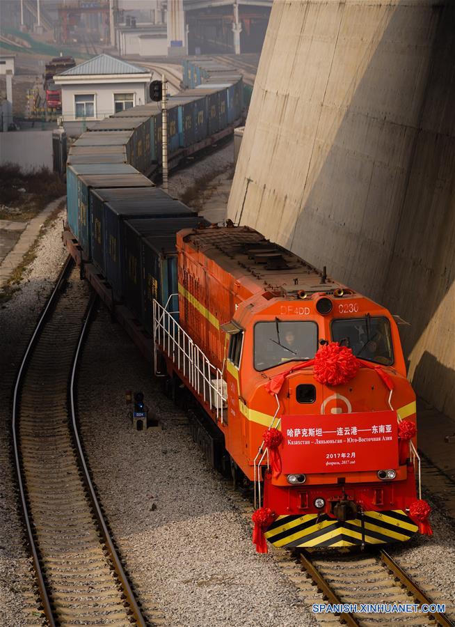 LIANYUNGANG, febrero 5, 2017 (Xinhua) -- Un tren que transporta 720 toneladas de trigo desde Kazajistán llega al puerto de Lianyungang, en la provincia de Jiangsu, en el este de China, el 5 de febrero de 2017. El primer cargamento de trigo de Kazajistán llegó al puerto de Lianyungang transportado por un tren de carga el domingo, y después fue enviado hacia el sureste de Asia, inaugurando una nueva ruta comercial. (Xinhua/Li Xiang)