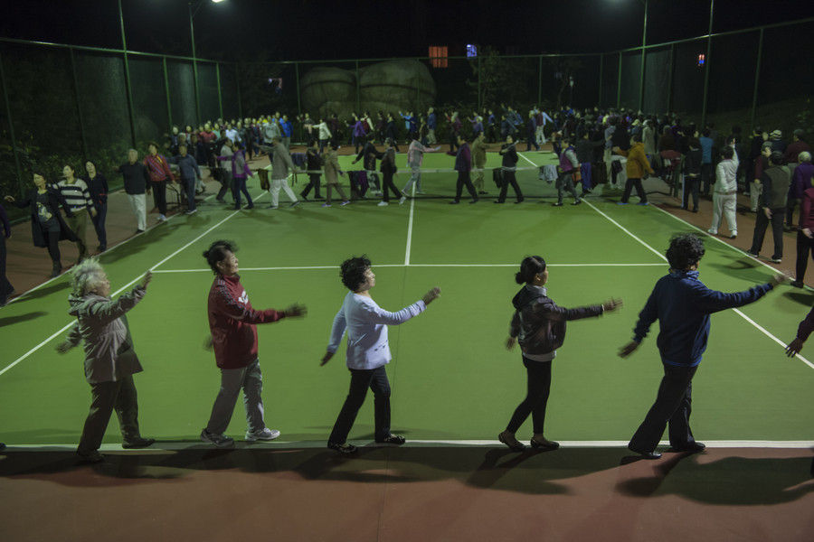 Muchas de las "aves migratorias" se unen a un baile de plaza, improvisado en una cancha de baloncesto de Wanning, provincia de Hainan. [Foto: VCG]
