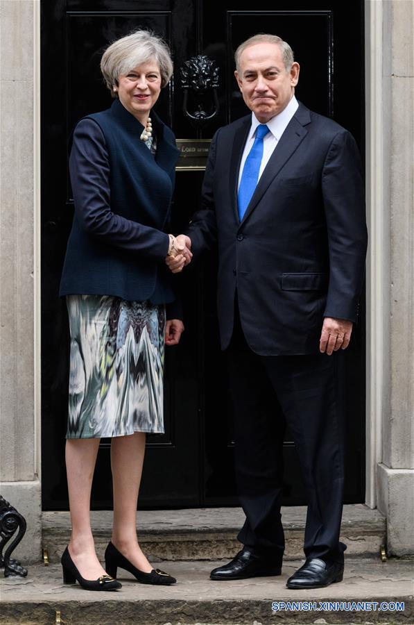 LONDRES, febrero 6, 2017 (Xinhua) -- La primera ministra británica, Theresa May (i), estrecha la mano con el primer ministro de Israel, Benjamin Netanyahu (d), previo a su reunión en el número 10 de la Calle Downing, en Londres, Reino Unido, el 6 de febrero de 2017. (Xinhua/Ray Tang)