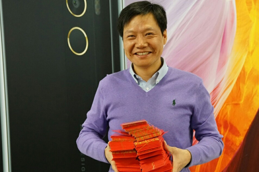 Lei Jun, fundador y CEO de la compa?ía móvil china Xiaomi Corp, está listo para dar un montón de hongbao en Beijing, el 3 de febrero de 2017. [Foto / Sina Weibo]