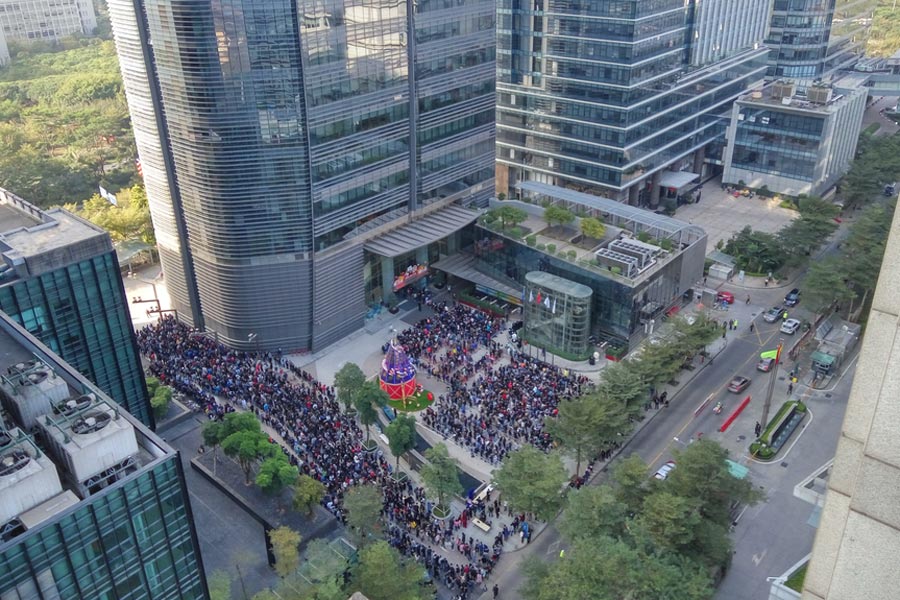 Empleados de Tencent aguardan para obtener su sobre rojo (hongbao), Shenzhen, provincia de Guangdong. [Foto: VCG]