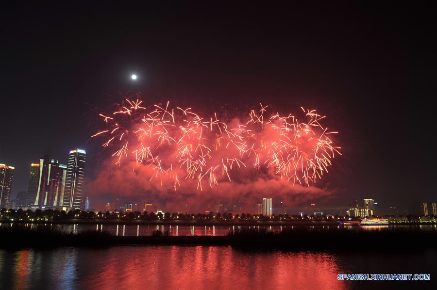 Fuegos artificiales explotan en el cielo para celebrar el Festival de las Linternas en Juzizhou, una isla en el Río Xiangjiang, en Changsha, capital de la provincia de Hunan, en China, el 11 de febrero de 2017. (Xinhua/Long Hongtao)
