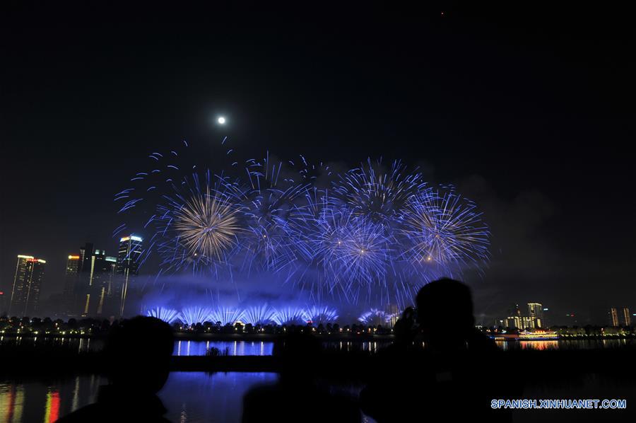 Fuegos artificiales explotan en el cielo para celebrar el Festival de las Linternas en Juzizhou, una isla en el Río Xiangjiang, en Changsha, capital de la provincia de Hunan, en China, el 11 de febrero de 2017. (Xinhua/Long Hongtao)