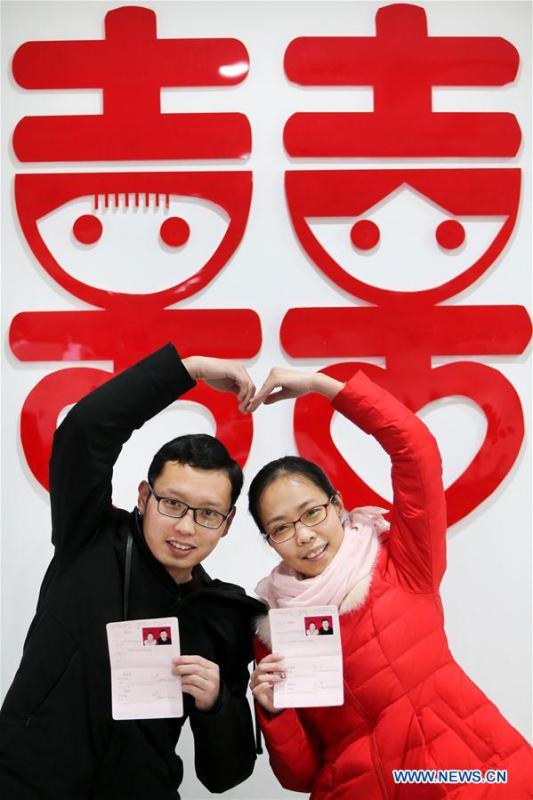Una pareja muestra su certificado de matrimonio en el Registro Civil del condado Suixi, provincia de Anhui, el 14 de febrero de 2017. Muchas parejas han elegido el Día de San Valentín para sellar su amor. (Xinhua)