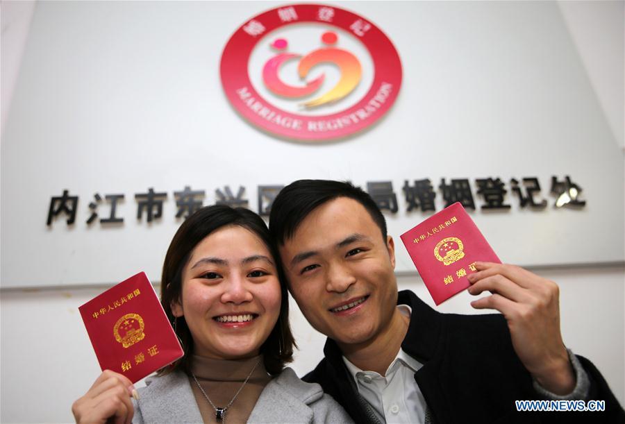 Una pareja muestra su certificado de matrimonio en el Registro Civil de Neijiang, provincia de Sichuan, el 14 de febrero de 2017. Muchas parejas han elegido el Día de San Valentín para sellar su amor. (Xinhua)