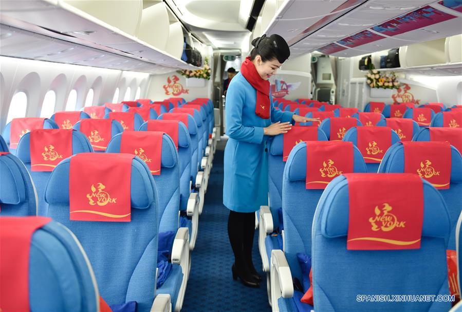 FUZHOU, febrero 15, 2017 (Xinhua) -- Una azafata arregla los asientos del vuelo MF849 previo a que lo aborden los pasajeros, en el Aeropuerto Internacional de Fuzhou, en Fuzhou, capital de la provincia de Fujian, en el sureste de China, el 15 de febrero de 2017. El vuelo MF849, el primer vuelo directo de Xiamen Airlines de Fuzhou hacia Nueva York, despegó el miércoles. (Xinhua/SongWeiwei)