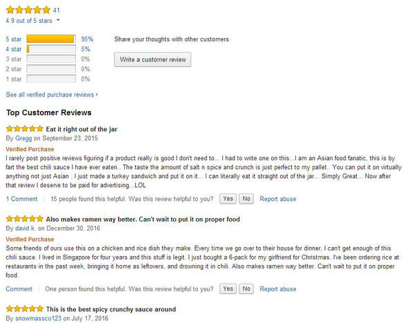Captura de pantalla de los comentarios sobre Lao Gan Ma en amazon.com. [Foto / chinadaily.com.cn]