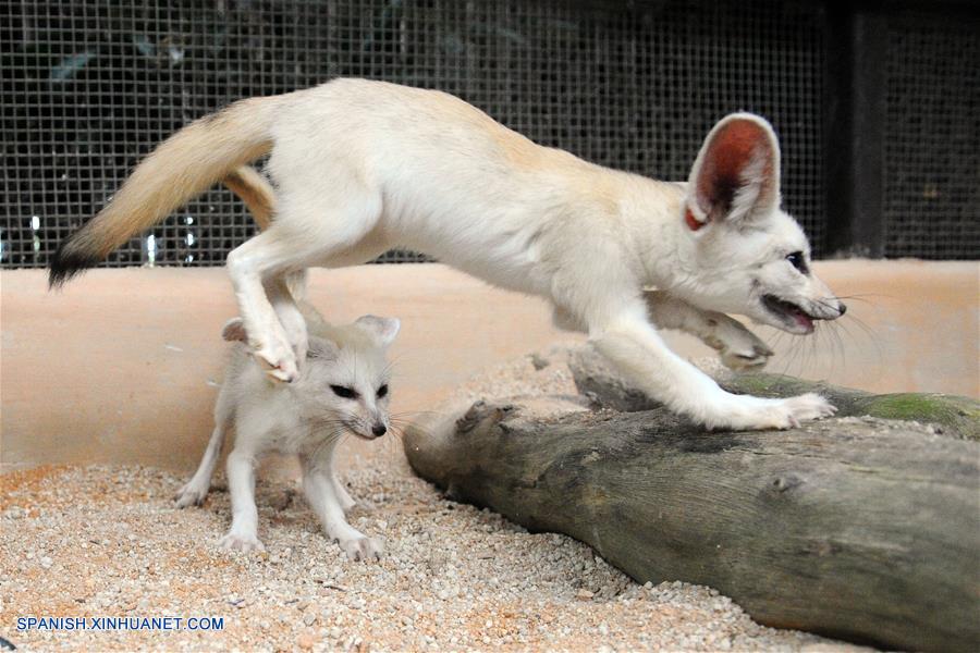 SINGAPUR, febrero 15, 2017 (Xinhua) -- Dos cachorros de zorro del desierto corren alrededor de un pozo de arena en el Zoológico de Singapur, capital de Singapur, el 15 de febrero de 2017. Los animales bajo el cuidado de las Reservas de Vida Silvestre de Singapur (WRS, por sus siglas en inglés), dieron a luz a más de 600 cachorros en 2016. (Xinhua/Then Chih Wey)