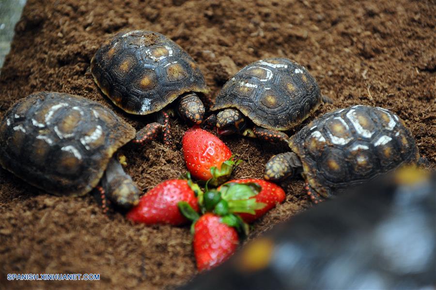SINGAPUR, febrero 15, 2017 (Xinhua) -- Un grupo de jóvenes tortugas de patas rojas se alimentan con fresas en el Zoológico de Singapur, capital de Singapur, el 15 de febrero de 2017. Los animales bajo el cuidado de las Reservas de Vida Silvestre de Singapur (WRS, por sus siglas en inglés), dieron a luz a más de 600 cachorros en 2016. (Xinhua/Then Chih Wey)