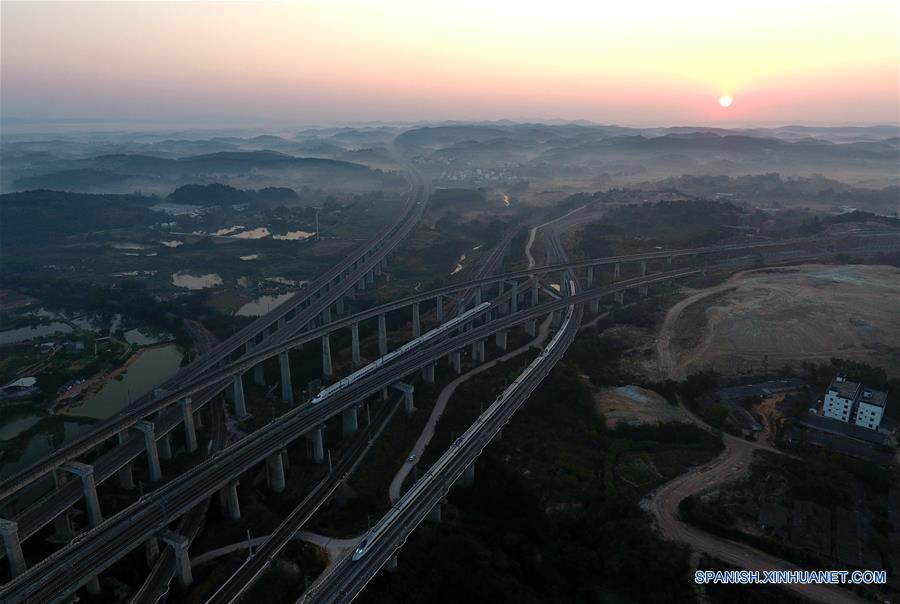 NANNING, febrero 19, 2017 (Xinhua) -- Trenes bala corren a través del puente de Tunli en Nanning, capital de la región autónoma zhuang de Guangxi, en el sur de China, el 19 de febrero de 2017. Guangxi construirá más de 2,000km de líneas de carril de alta velocidad para unir a todas las ciudades de la región a lo largo de la vigencia del XIII Plan Quinquenal (2016-2020). (Xinhua/Huang Xiaobang)