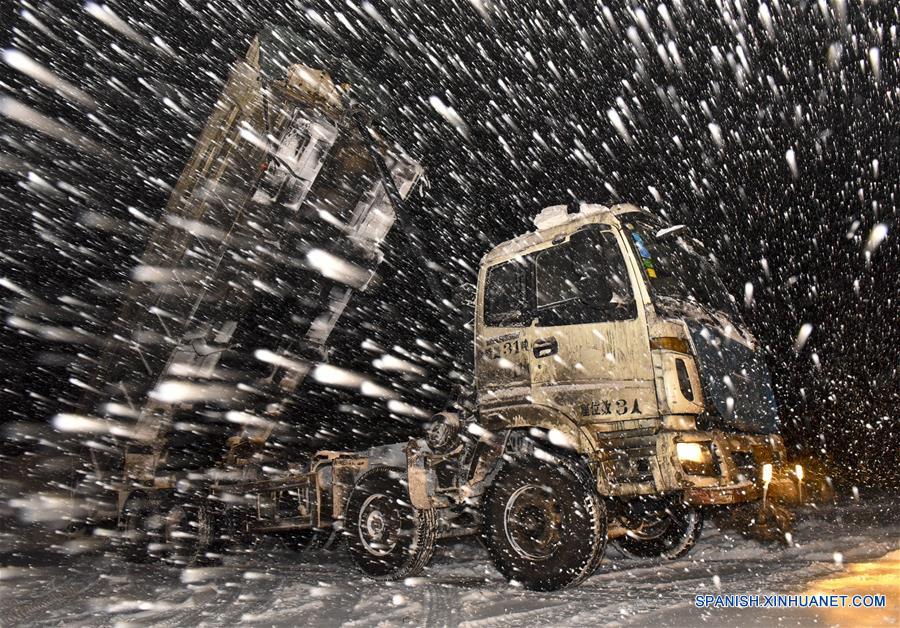 XINJIANG, febrero 20, 2017 (Xinhua) -- Un vehículo descarga nieve en Urumqi, capital de la región autónoma Uygur de Xinjiang, en el noroeste de China, el 19 de febrero de 2017. Urumqi ha sido testigo de una intensa tormenta de nieve desde el domingo. (Xinhua/Hu Huhu)