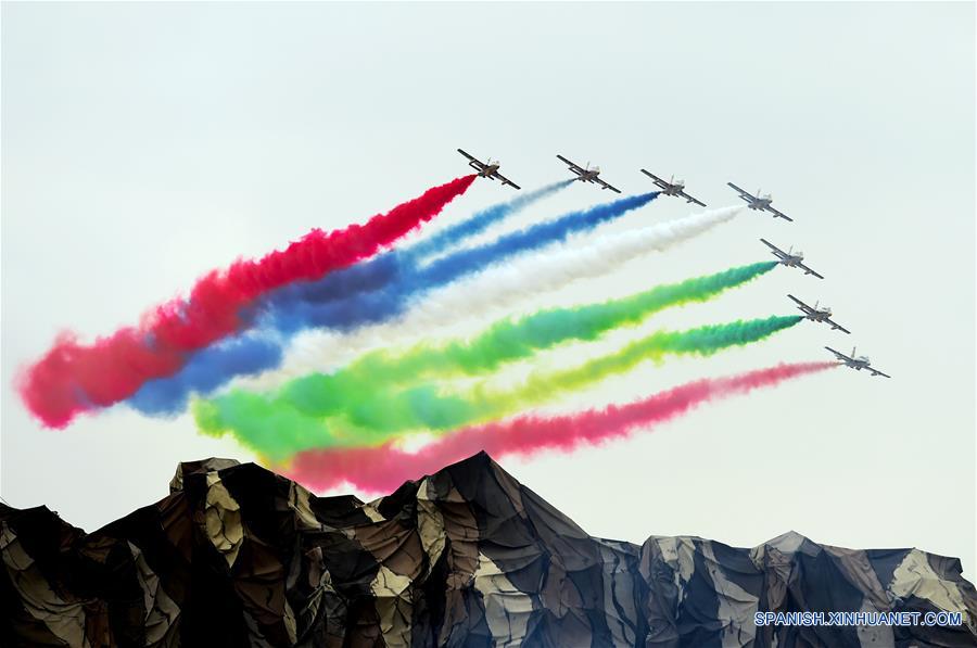 BU DABI, febrero 20, 2017 (Xinhua) -- Aviones del equipo acrobático Al Fursan participan en un espectáculo militar durante la Exhibición y Conferencia Internacional de Defensa (IDEX, por sus siglas en inglés), en Abu Dabi, Emiratos Arabes Unidos, el 20 de febrero de 2017. De acuerdo con información de la prensa local, el IDEX comenzó en Abu Dabi el 19 de febrero, con un enfoque especial en la tecnología disruptiva. (Xinhua/Zhao Dingzhe)