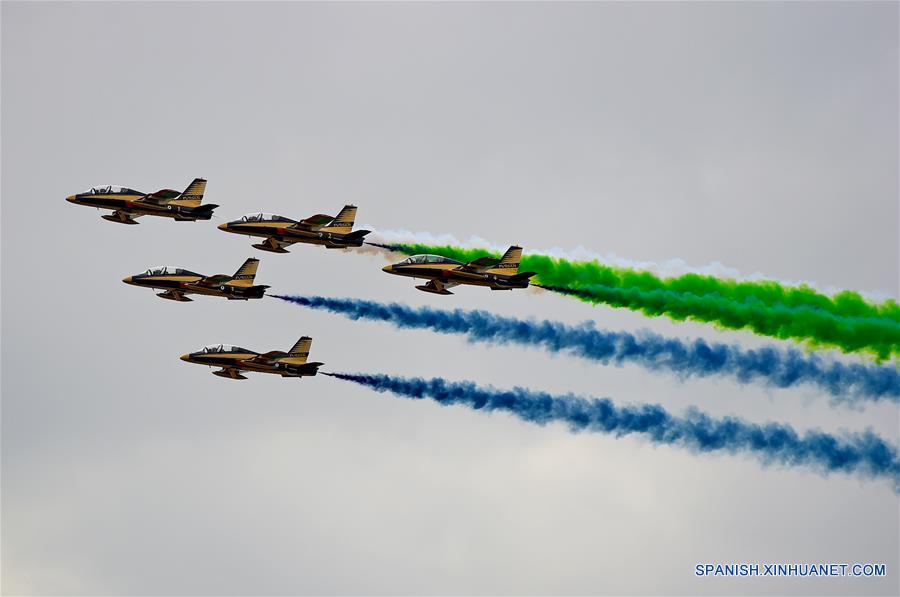 ABU DABI, febrero 20, 2017 (Xinhua) -- Aviones del equipo acrobático Al Fursan participan en un espectáculo militar durante la Exhibición y Conferencia Internacional de Defensa (IDEX, por sus siglas en inglés), en Abu Dabi, Emiratos Arabes Unidos, el 20 de febrero de 2017. De acuerdo con información de la prensa local, el IDEX comenzó en Abu Dabi el 19 de febrero, con un enfoque especial en la tecnología disruptiva. (Xinhua/Zhao Dingzhe)