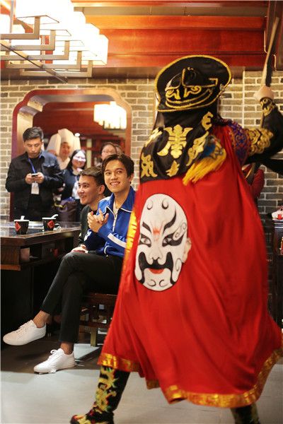 Dimash Kudaibergenov disfruta de una actuación de ópera de Sichuan en un restaurante de hotpot de Chengdu, provincia de Sichuan, 18 de febrero de 2017. [Foto de chinadaily.com.cn]