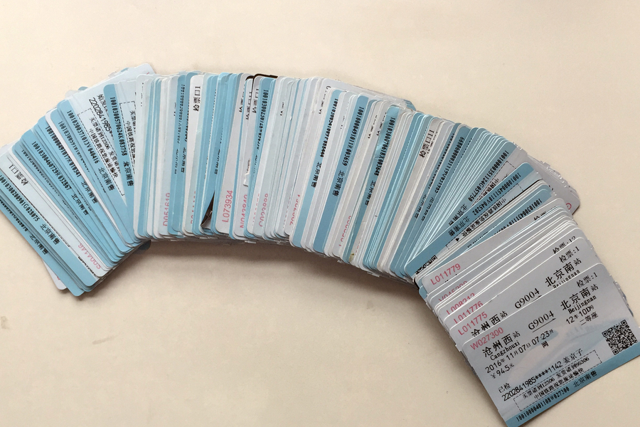 Algunos de los billetes de tren que Jiang ha acumulado con el tiempo. [Foto / VCG]