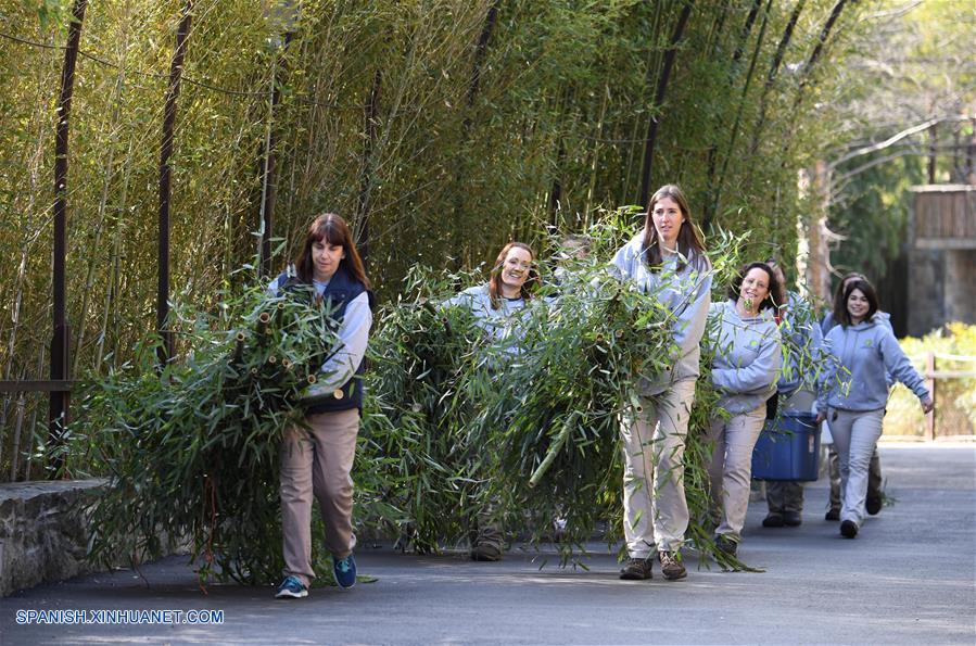 WASHINGTON D.C., febrero 21, 2017 (Xinhua) -- Cuidadoras del Zoológico Nacional Smithsoniano cargan bamboo que se usará como comida durante el vuelo hacia China del panda gigante Bao Bao, en Washington D.C., Estados Unidos de América, el 21 de febrero de 2017. El panda gigante Bao Bao, nacido en Estados Unidos de América, llegará a la provincia de Sichuan, en el suroeste de China, el miércoles por la noche, hora de Beijing. (Xinhua/Yin Bogu)
