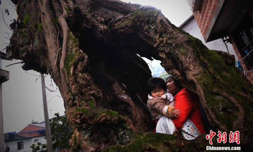 Un árbol de la especie Ficus Virens ha sobrevivido durante 100 a?os en la aldea Xinwu, en Nanchuan, Chongqing. Bajo la protección de los residentes, el imponente gigante es el referente indiscutible de la zona. Incluso, con frecuencia los ni?os juegan en el hueco de su robusto tronco.