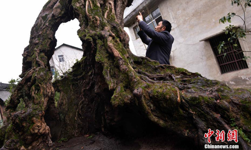 Chongqing,24/02/2017(El Pueblo en Línea)-Un árbol de la especie Ficus Virens ha sobrevivido durante 100 a?os en la aldea Xinwu, en Nanchuan, Chongqing. Bajo la protección de los residentes, el imponente gigante es el referente indiscutible de la zona. Incluso, con frecuencia los ni?os juegan en el hueco de su robusto tronco.