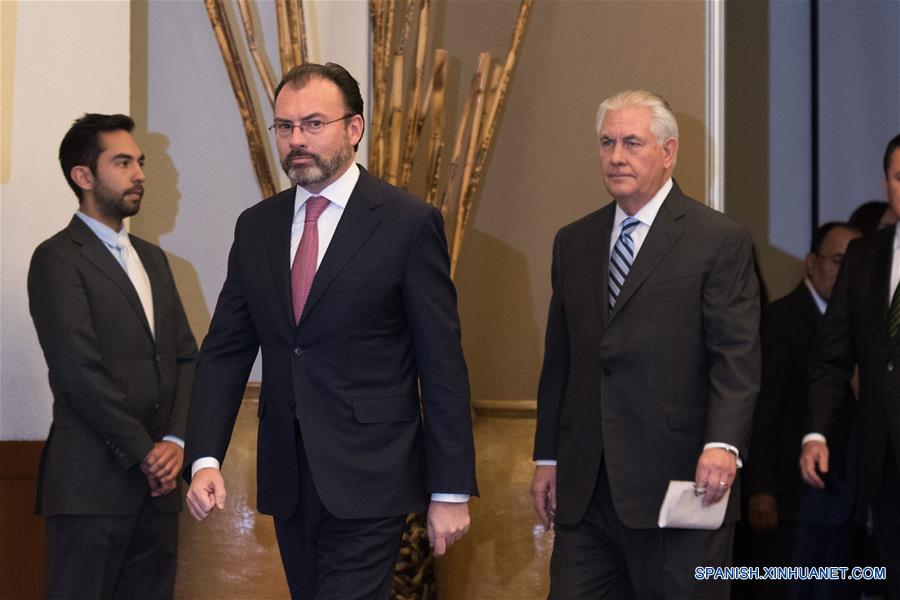 CIUDAD DE MEXICO, febrero 23, 2017 (Xinhua) -- El secretario de Relaciones Exteriores de México, Luis Videgaray (2-i), y el secretario de Estado de Estados Unidos de América, Rex Tillerson (d), llegan para una conferencia de prensa conjunta en la Ciudad de México, capital de México, el 23 de febrero de 2017. El secretario de Relaciones Exteriores de México, Luis Videgaray, dijo en la conferencia de prensa que durante la reunión con los secretaros de Estado y Seguridad de Estados Unidos de América, Rex Tillerson y John Kelly, respectivamente, y el secretario de Gobernación de México, Osorio Chong, se acordó asumir una responsabilidad compartida en el tema de la migración, y que es un proceso que será largo, no sencillo, pero con pasos en la dirección correcta, de acuerdo con información de la prensa local. (Xinhua/Francisco Ca?edo)