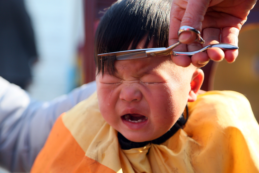 Un ni?o llora mientras le cortan el pelo en Nantong, provincia de Jiangsu, 27 de febrero. [Foto: VCG]