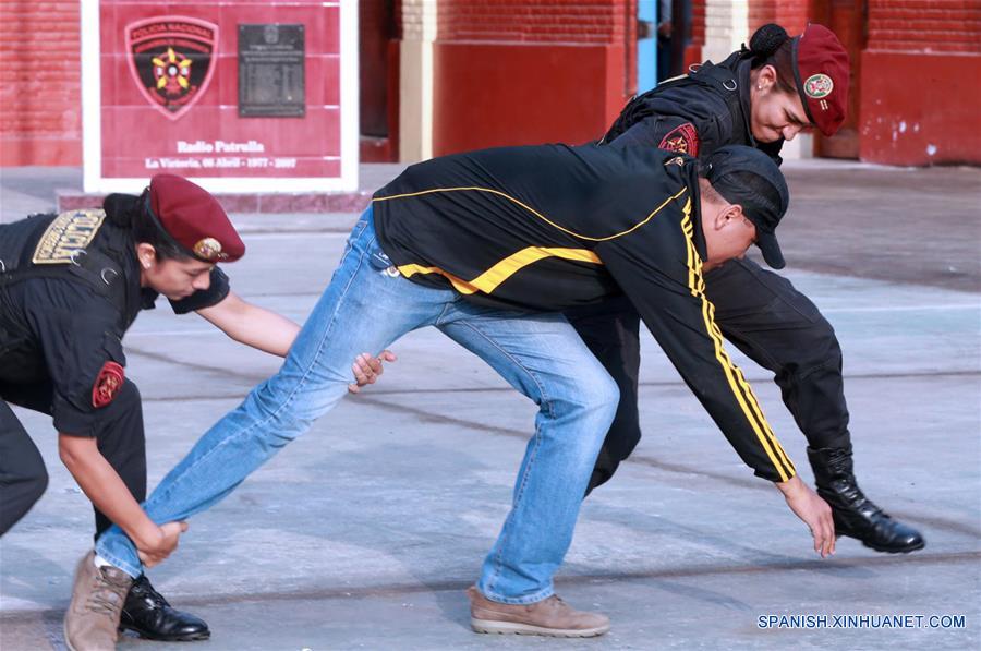 Policías que integran el Escuadrón de Emergencia de la Policía Nacional de Perú (PNP) participan en una demostración durante la celebración del Día Internacional de la Mujer, en Lima, Perú, el 7 de marzo de 2017. El tema central del Día Internacional de la Mujer de 2017 de la Organización de las Naciones Unidas (ONU), que se celebrará el 8 de marzo, será "Las mujeres en un mundo laboral en transformación: hacia un planeta 50-50 en 2030". (Xinhua/Norman Córdova/ANDINA)