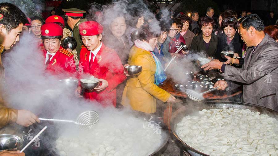 Parientes y amigos desayunan dumplings durante la boda de Lyu Shaonan, la hija del amigo de Meng, en noviembre de 2015. [Foto / qq.com]