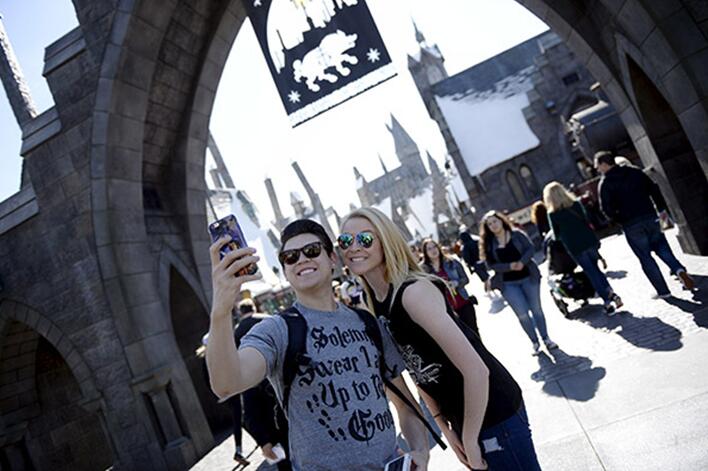 Dos visitantes se hacen una foro antes de entrar en Hogsmeade Village durante un recorrido por el mundo mágico del parque temático de Harry Potter en Universal Studios, Los ángeles, California. [Foto / Agencias]