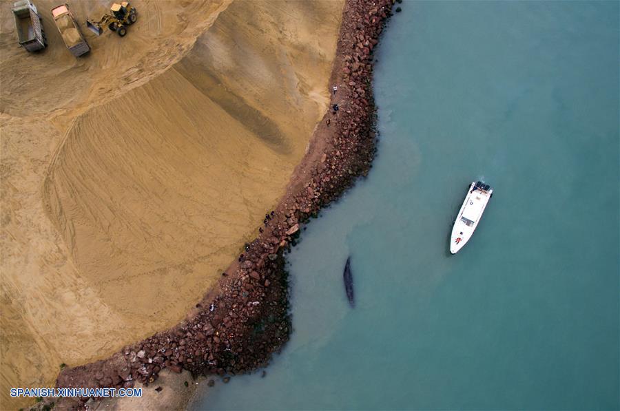 GUANGDONG, marzo 15, 2017 (Xinhua) -- Un barco de rescate permanece junto a un cachalote cerca de un muelle en el Puerto de Huizhou, en la provincia de Guangdong, en el sur de China, el 14 de marzo de 2017. Un cachalote quedó varado cerca de un muelle en Huizhou el martes. Las labores de rescate continúan con dificultad debido a que el cachalote se encuentra débil. (Xinhua/Mao Siqian)