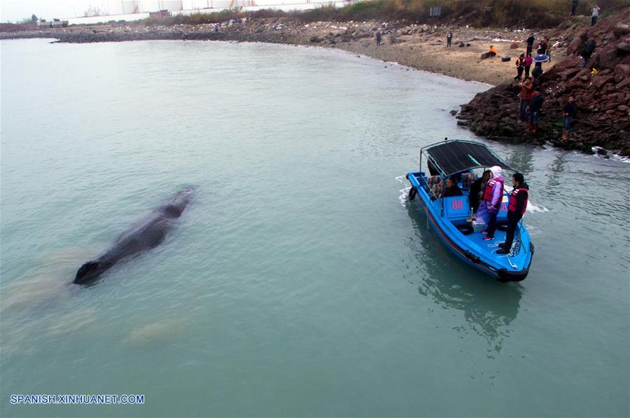 GUANGDONG, marzo 15, 2017 (Xinhua) -- Rescatistas observan el movimiento de un cachalote cerca de un muelle en el Puerto de Huizhou, en la provincia de Guangdong, en el sur de China, el 14 de marzo de 2017. Un cachalote quedó varado cerca de un muelle en Huizhou el martes. Las labores de rescate continúan con dificultad debido a que el cachalote se encuentra débil. (Xinhua/Mao Siqian)
