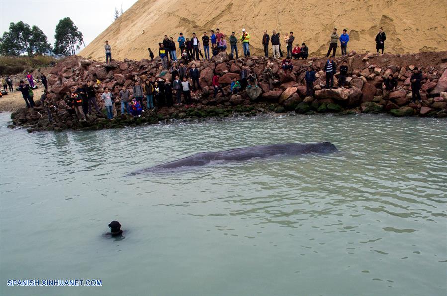 GUANGDONG, marzo 15, 2017 (Xinhua) -- Un buzo coloca un dispositivo de prueba de audición en un cachalote cerca de un muelle en el Puerto de Huizhou, en la provincia de Guangdong, en el sur de China, el 14 de marzo de 2017. Un cachalote quedó varado cerca de un muelle en Huizhou el martes. Las labores de rescate continúan con dificultad debido a que el cachalote se encuentra débil. (Xinhua/Mao Siqian)