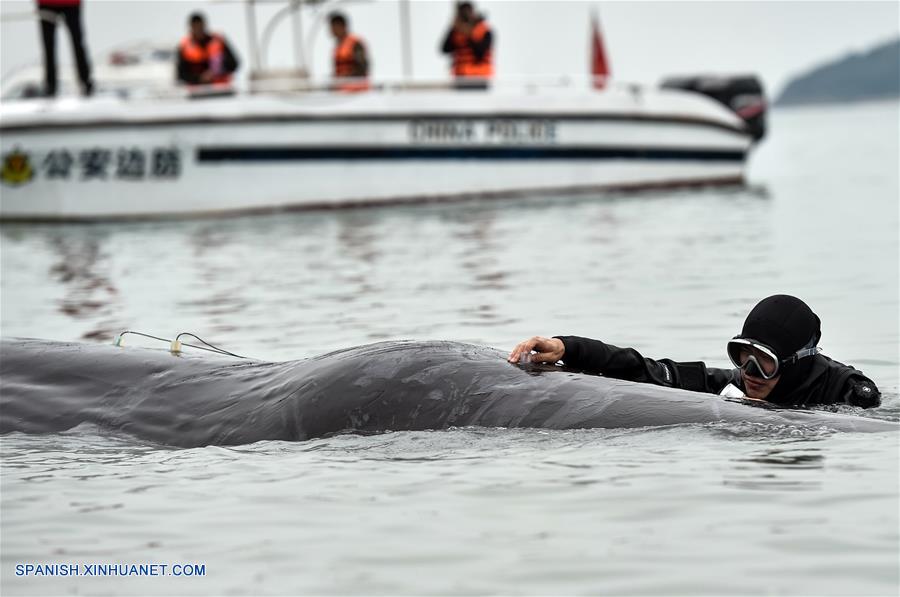 GUANGDONG, marzo 15, 2017 (Xinhua) -- Un buzo coloca un dispositivo de prueba de audición en un cachalote cerca de un muelle en el Puerto de Huizhou, en la provincia de Guangdong, en el sur de China, el 14 de marzo de 2017. Un cachalote quedó varado cerca de un muelle en Huizhou el martes. Las labores de rescate continúan con dificultad debido a que el cachalote se encuentra débil. (Xinhua/Mao Siqian)
