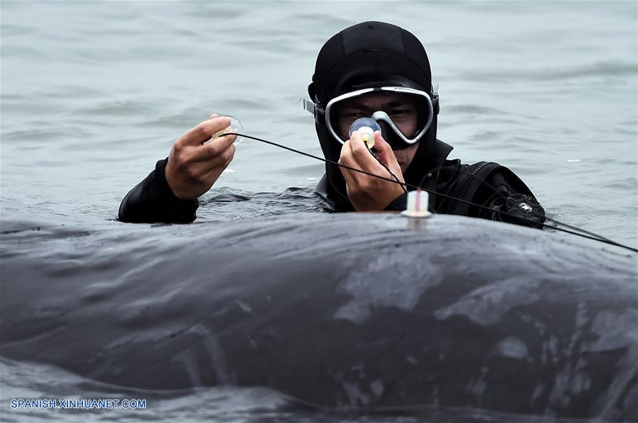 GUANGDONG, marzo 15, 2017 (Xinhua) -- Un buzo coloca un dispositivo de prueba de audición en un cachalote cerca de un muelle en el Puerto de Huizhou, en la provincia de Guangdong, en el sur de China, el 14 de marzo de 2017. Un cachalote quedó varado cerca de un muelle en Huizhou el martes. Las labores de rescate continúan con dificultad debido a que el cachalote se encuentra débil. (Xinhua/Mao Siqian)