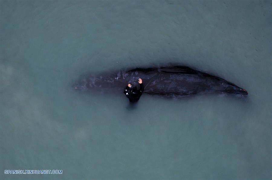 GUANGDONG, marzo 15, 2017 (Xinhua) -- Un buzo coloca un dispositivo de prueba de audición en un cachalote cerca de un muelle en el Puerto de Huizhou, en la provincia de Guangdong, en el sur de China, el 14 de marzo de 2017. Un cachalote quedó varado cerca de un muelle en Huizhou el martes. Las labores de rescate continúan con dificultad debido a que el cachalote se encuentra débil. (Xinhua/Mao Siqian)