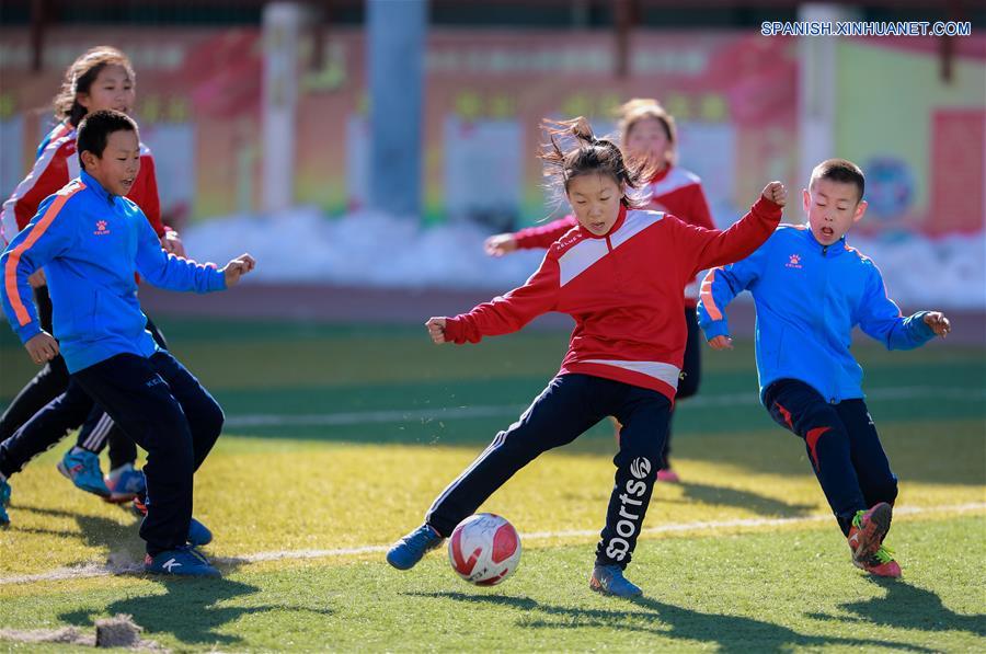 HOHHOT, marzo 15, 2017 (Xinhua) -- Las integrantes de un equipo de fútbol de ni?as de una escuela primaria compiten con ni?os durante un partido de fútbol, en el distrito de Yuquan de Hohhot, capital de la Región Autónoma de Mongolia Interior, en el norte de China, el 15 de marzo de 2017. (Xinhua/Ding Genhou)