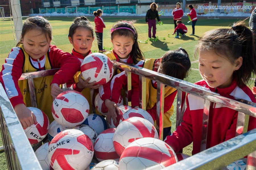 HOHHOT, marzo 15, 2017 (Xinhua) -- Ni?as de un equipo de fútbol de una escuela primaria realizan juegos mientras participan en un entrenamiento, en el distrito de Yuquan de Hohhot, capital de la Región Autónoma de Mongolia Interior, en el norte de China, el 15 de marzo de 2017. (Xinhua/Ding Genhou)