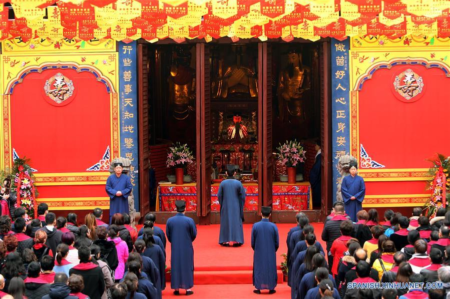 Una ceremonia es llevada a cabo en el templo Chenghuang (El Templo de la Ciudad de Shanghai) deseando la prosperidad de la ciudad, en Shanghai, en el este de China, el 18 de marzo de 2017. (Xinhua/Liu Ying)