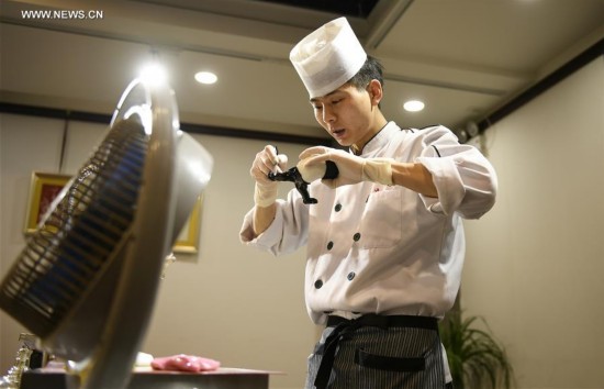 El chef Zhang Heng crea una figura de azúcar con forma de panda en un restaurante de Yinchuan, capital de la región autónoma Hui de Ningxia, el 10 de marzo de 2017. Las figuras de azúcar son adornos magníficos para las fiestas. [Foto / Xinhua]