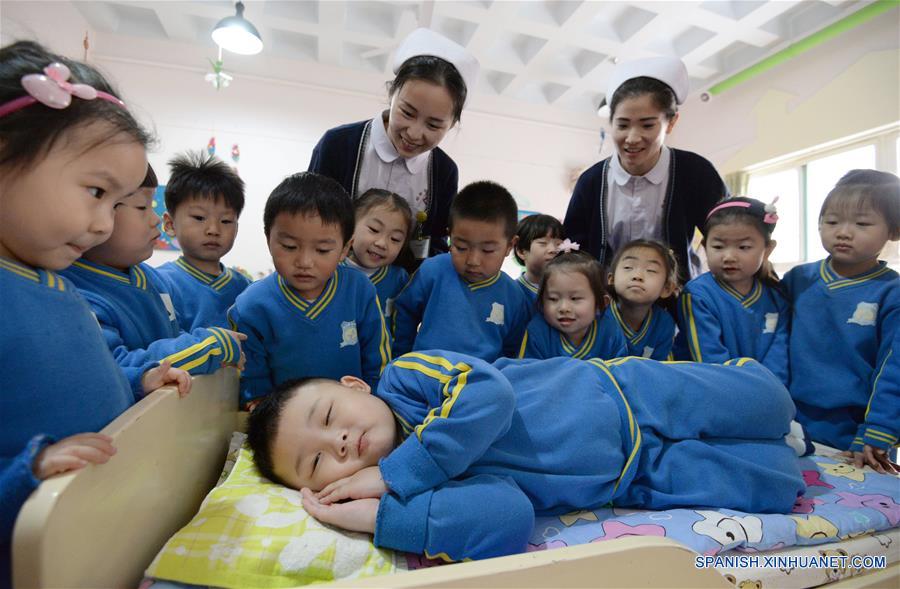 HEBEI, marzo 21, 2017 (Xinhua) -- Enfermeras ense?an la postura correcta para dormir para un ni?o en la ciudad de Handan, provincia de Hebei, en el norte de China, el 21 de marzo de 2017. El martes se celebra el Día Mundial del Sue?o. (Xinhua/Hao Qunying)