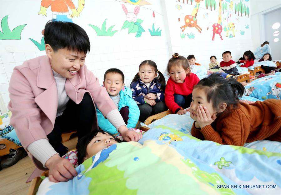 JIANGSU, marzo 21, 2017 (Xinhua) -- Una maestra ense?a la forma correcta de dormir en un jardín de ni?os en el condado Donghai, provincia de Jiangsu, en el este de China, el 21 de marzo de 2017. El martes se celebra el Día Mundial del Sue?o. (Xinhua/Zhang Kaihu)