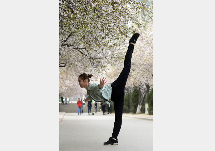 Una joven de la Facultad de Danza de la Universidad Normal de Shandong posa para los reporteros en Jinan, provincia de Shandong, el 22 de marzo de 2017, rodeada de árboles llenos de flores de primavera. [Foto / VCG]