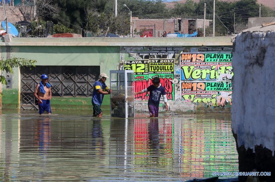 HUARMEY, marzo 22, 2017 (Xinhua) -- Personas caminan a través del agua de la inundación en la ciudad de Huarmey, en el sur de la región Ancash, Perú, el 22 de marzo de 2017. Las fuertes lluvias que se registran en Perú persistirán durante al menos dos semanas en 12 regiones del país sudamericano, informó el martes el Centro de Operaciones de Emergencia Nacional (COEN). De acuerdo con la entidad, las regiones más afectadas continuarán siendo Tumbes, Piura, Lambayeque, La Libertad y Ancash en el noroeste, Lima en el centro-este, Ica, Arequipa, Moquegua y Tacna en el sur, y Huancavelica y Ayacucho en el sureste. (Xinhua/Vidal Tarqui/ANDINA)