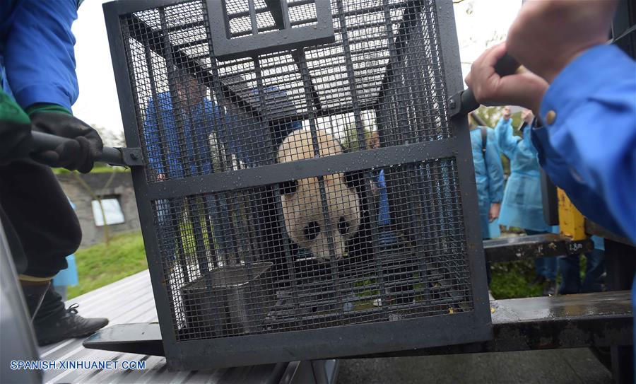SICHUAN, marzo 24, 2017 (Xinhua) -- Empleados trasladan del área de cuarentena de la base Dujiangyan del Centro de Conservación e Investigación del Panda Gigante de China a la panda gigante Bao Bao, en la provincia de Sichuan, en el suroeste de China, el 24 de marzo de 2017. Bao Bao, una panda gigante nacida en Estados Unidos de América, terminó su periodo de cuarentena el viernes. (Xinhua/Xue Yubin)